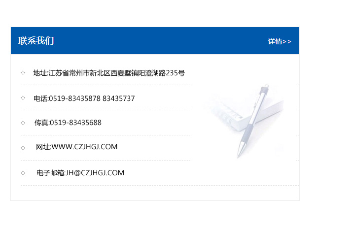 地址:常州市新北區友邦商務大廈1幢16、17層  電話:0519-85101652  傳真:0519-85112595  郵編:213022  網址:www.cz-jiayue_cn.hxmeeting.com  郵箱:xiajifengaa@163.com